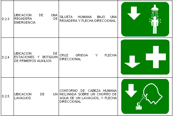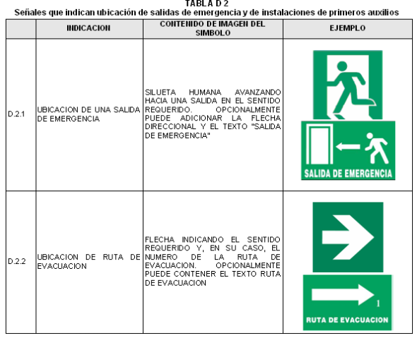 En el presente apéndice se establecen las señales para informar sobre ubicación de equipo contra incendio, equipo y estaciones de protección y atención en casos de emergencia, e instalaciones para personas con discapacidad, según las tablas D 1, D 2 y D 3.