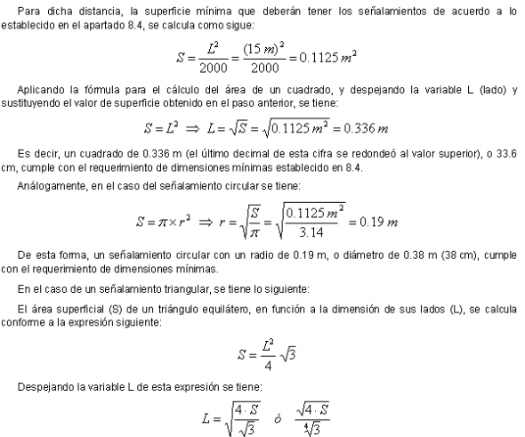 Cálculo para determinar las dimensiones mínimas que deben tener los señalamientos, para cumplir con el requerimiento establecido en el punto 8.4.