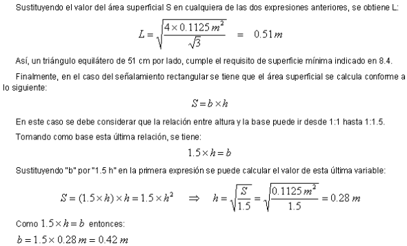 Es decir, un señalamiento rectangular de 0.28 m ´ 0.42 m (28 cm ´ 42 cm), cubriría el requerimiento de dimensiones mínimas, y de relación altura-base de 1:1.5.