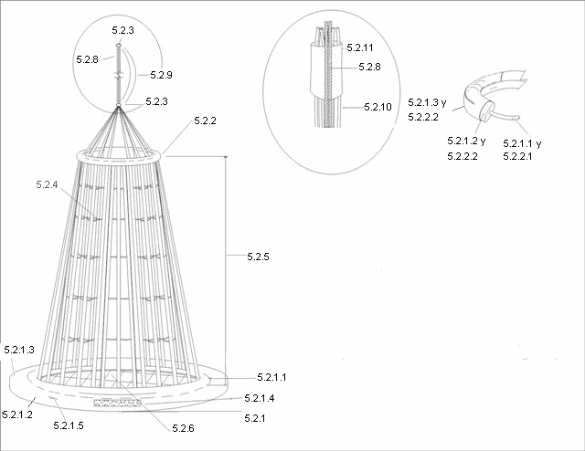 5.2.4 La malla de la CED debe ser tejida con cabo de tres torones en polipropileno multifilamento, con un diámetro mínimo de 1,90 cm, la cual debe estar diseñada con tres cabos horizontales y tres verticales como mínimo por cada puntos de atraque o apoyo, la cual sujetada del anillo superior hace estructura con el anillo inferior y actúa como elemento de carga.