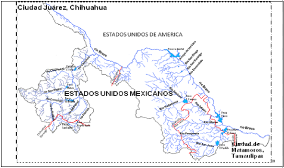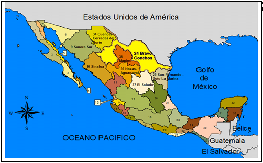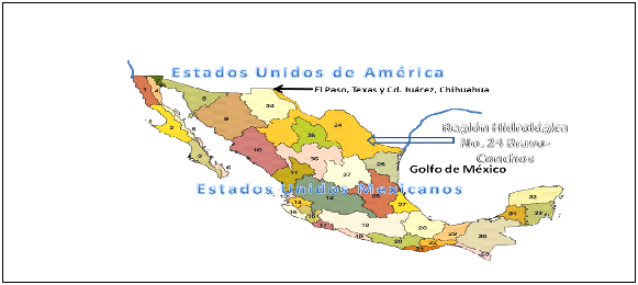 La Región Hidrológica número 24 Bravo-Conchos, se localiza al norte del país y está limitada al norte por los Estados Unidos de América, al sur por las Regiones Hidrológicas números 35 Mapimí, 36 Nazas-Aguanaval y 37 El Salado; al este por la Región Hidrológica número 25 San Fernando- Soto la Marina y al oeste las Regiones Hidrológicas números 9 Sonora Sur, 10 Sinaloa y 34 Cuencas Cerradas del Norte. La figura 2 ilustra la ubicación de la Región Hidrológica número 24 Bravo-Conchos.