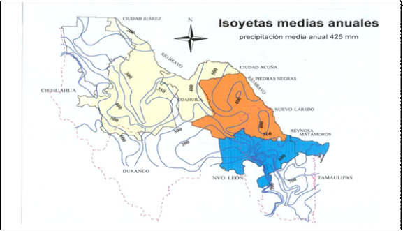 La precipitación media es de 485.8 milímetros, la cual es de las más bajas del país y sólo llega al 62% de la media nacional. La precipitación disminuye substancialmente del Golfo de México hacia el poniente. El efecto de las sequías es muy significativo; en los últimos 50 años se han presentado tres períodos críticos: 1948-1954, 1960-1964 y 1993 a la fecha, con duración de 2 a 4 meses. Las sequías se presentan con frecuencia de 10 años y la más reciente inició en 1993.