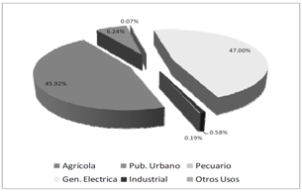 El sector agrícola emplea el 87% del volumen total para usos consuntivos y tiene una eficiencia media en los distritos de riego del orden del 34% y en las unidades de riego del 55%.