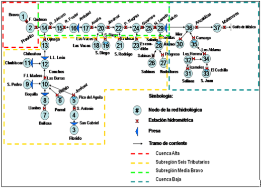 Considerando los puntos de control hidrológico existentes, como son estaciones hidrométricas, presas u otros embalses, así como la calidad y cantidad de la información histórica con que se cuenta en estos puntos, la Región Hidrológica número 24 Bravo-Conchos, está integrada por 37 cuencas hidrológicas y éstas se agrupan en cuatro subregiones hidrológicas, como se muestra en las figuras 4 y 5 y en las tablas 1 y 2.
