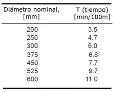 Tabla A2. Tiempo mínimo de prueba para varios diámetros de tubería