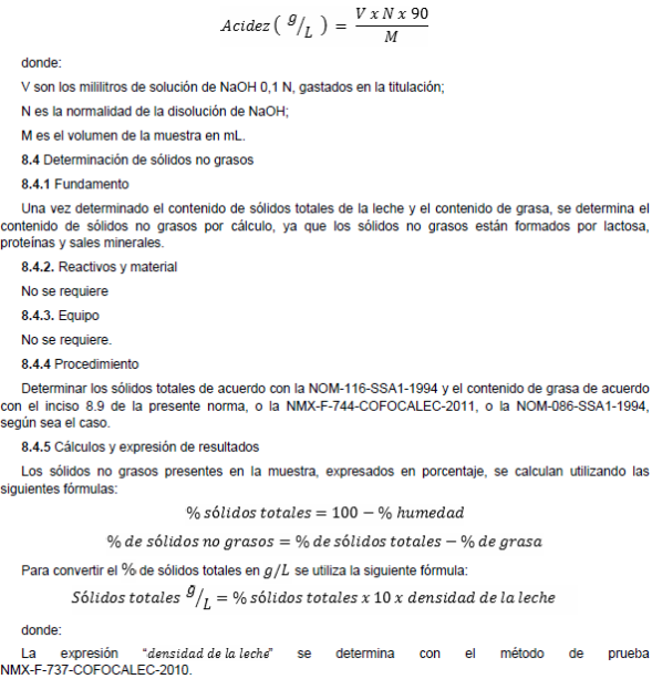 Norma Oficial Mexicana NOM-155-SCFI-2012, Leche-Denominaciones, especificaciones fisicoquímicas, información comercial y métodos de prueba.