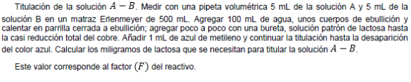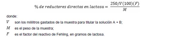 La concentración de lactosa contenida en la muestra, expresada en porcentaje, se calcula con la siguiente fórmula: