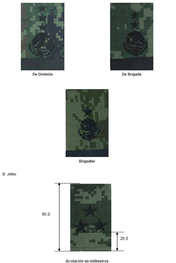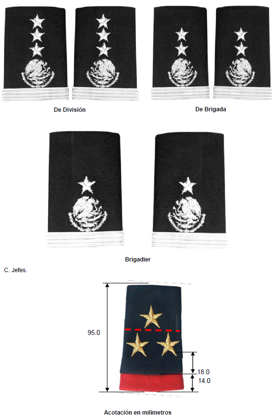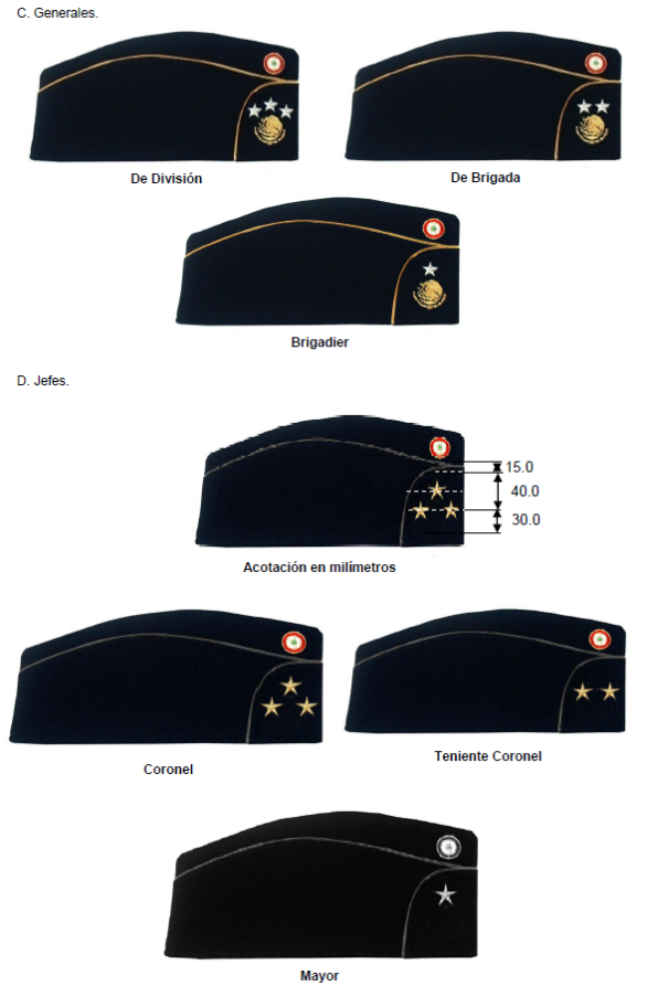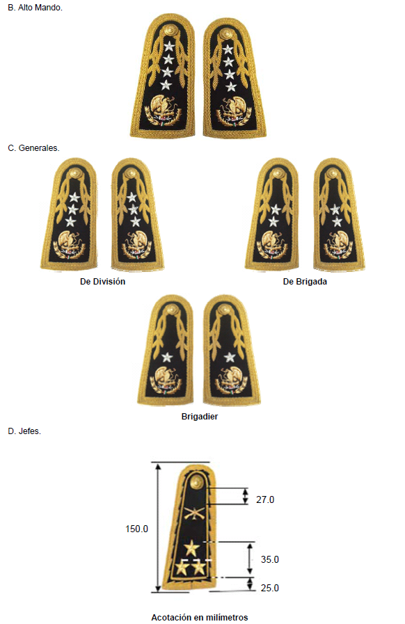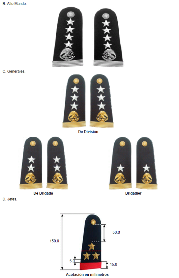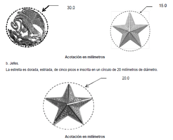 a. Mando Supremo, Alto Mando y Generales. El Escudo Nacional inscrito en un círculo de 30 milímetros de diámetro y las estrellas plateadas estriadas de cinco picos inscritas en un círculo de 15 milímetros de diámetro.