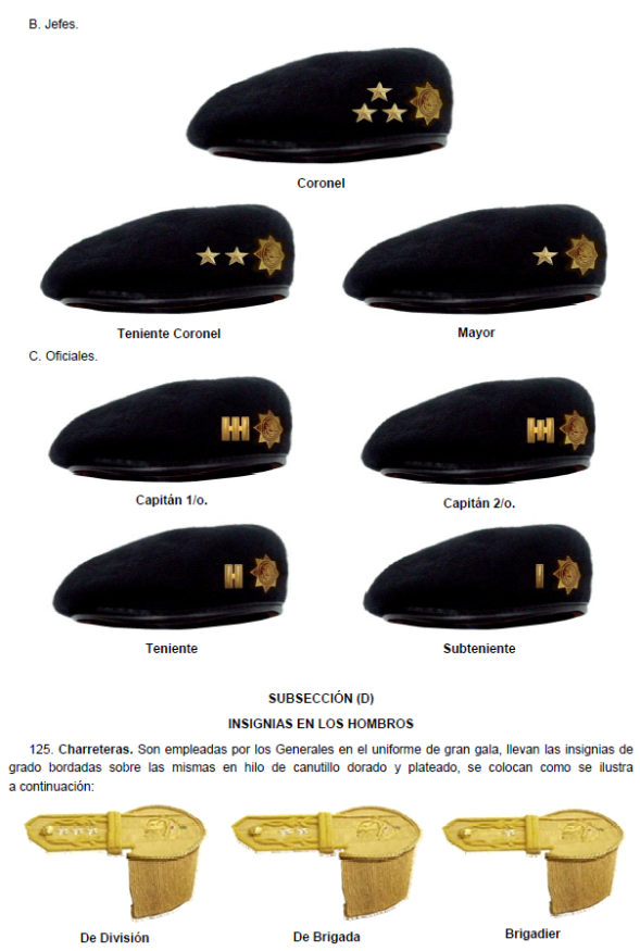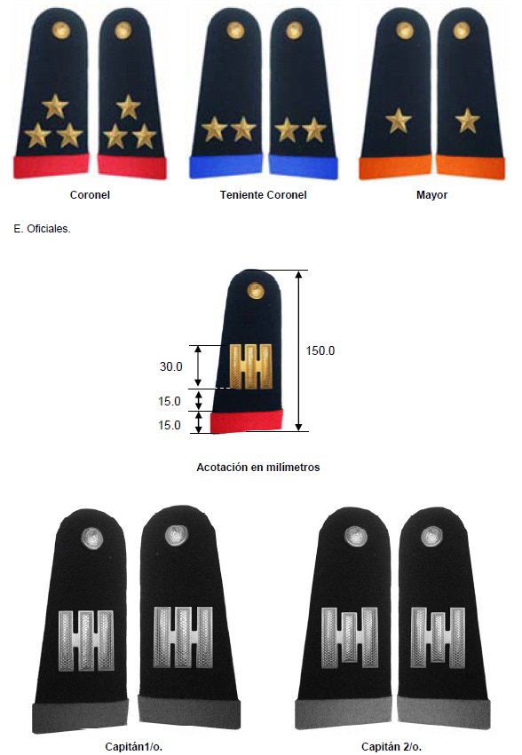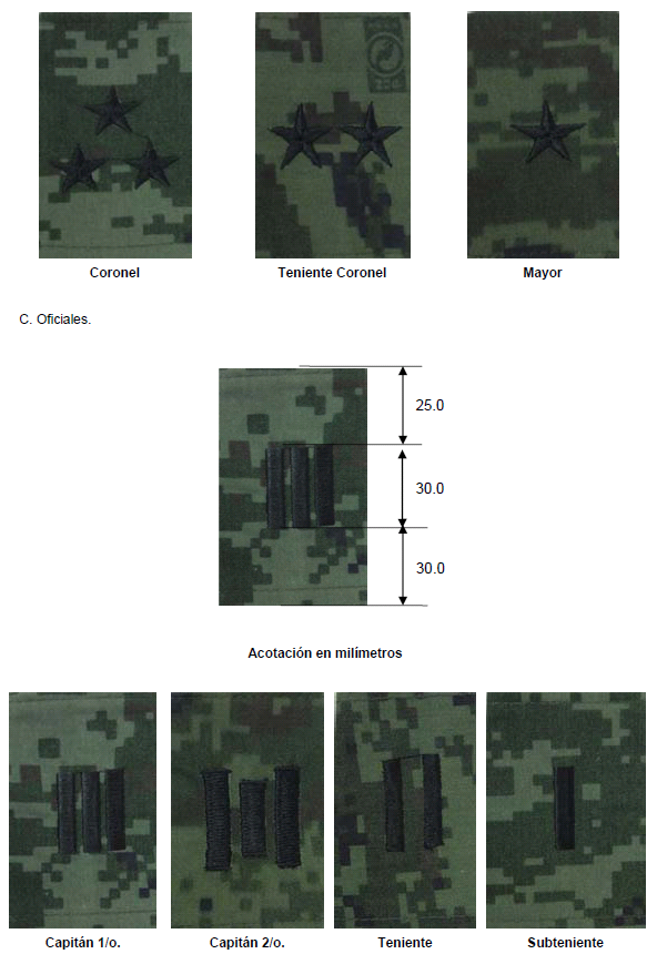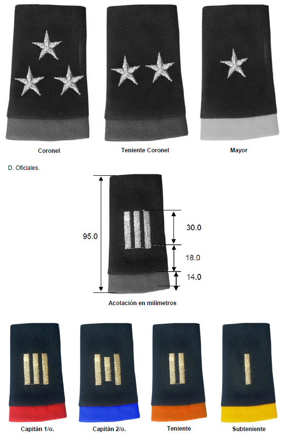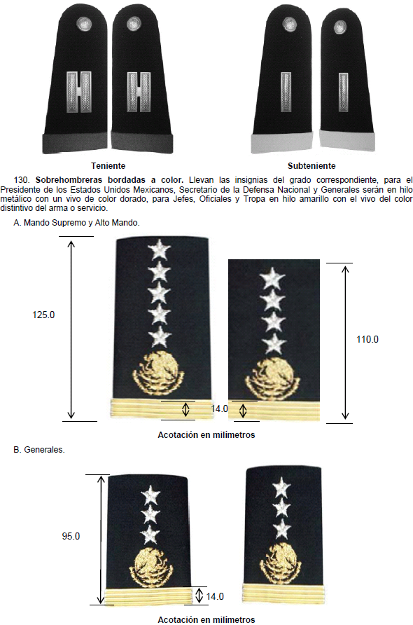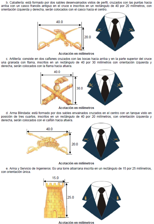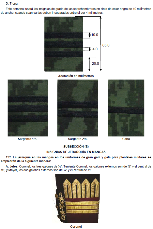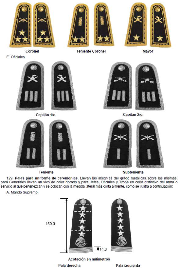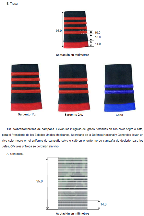 135. Distintivo de Soldado de Primera. En el uniforme administrativo, se coloca en las sobrehombreras y consiste en media cinta de color negro de 30 por 8 milímetros de ancho, dejando en las orillas un vivo de 2 milímetros del color del arma o servicio respectivo. En el uniforme de campaña, será en color negro sin vivos y se coloca en forma vertical.