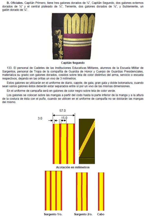 134. Distintivo de Cadete de Primera. Consiste en un galón dorado, cosido sobre tela del color distintivo de la Institución Educativa Militar, Arma o Servicio que corresponda, dejando un vivo de 3 milímetros de ancho en cada lado. En el uniforme de campaña será en un galón de color negro sobre tela de color verde.