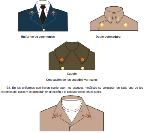 137. En los uniformes de ceremonias, doble botonadura y capote, los escudos metálicos se colocarán en forma vertical a 90° con la horizontal, en los uniformes que tengan costura visible en el cuello, los escudos se alinearán con la misma.