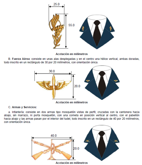 139. Los escudos de las armas, servicios, cuerpos especiales, instituciones educativas militares y de especialidad del Ejército y Fuerza Aérea que se colocan en los uniformes son metálicos, en aleación de latón, con recubrimiento color oro y en la parte posterior cuentan con clavos para su sujeción.