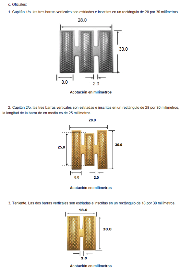 A. Para Generales: está formado por una rama de laurel con cinco hojas y una rama de encino entrelazadas, inscritas en un rectángulo de 25 por 55 milímetros y serán colocados con la rama de laurel hacia adentro.
