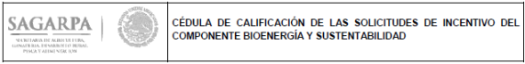 | Nota: Esta cédula deberá ser validada por la instancia ejecutora correspondiente, siempre y cuando sean elegibles para conforme a los requisitos correspondientes de las Reglas de Operación de la SAGARPA. Esta cédula deberá adjuntarse para cada solicitud de incentivo dictaminada. Para acceder a los apoyos se deberá contar con una calificación igual o mayor a 70 puntos. |