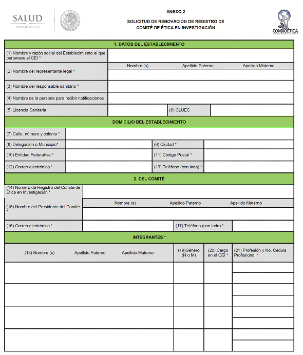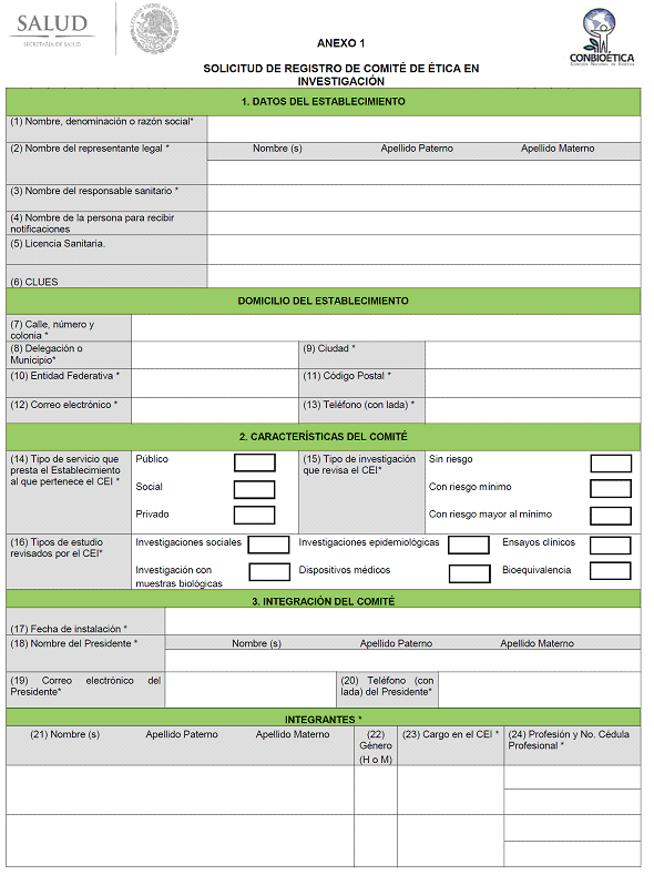 (1) Asentar el nombre, denominación o razón social del Establecimiento solicitante al que pertenece el Comité, tal como aparece en el documento con el que se acredite la autorización sanitaria para realizar investigación en seres humanos.