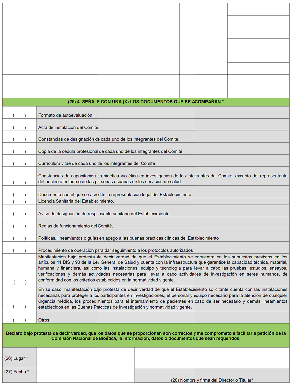 (25) Asentar el nombre completo en el orden siguiente: nombre(s), apellido paterno y apellido materno, así como la firma del Director o Titular del Establecimiento solicitante.