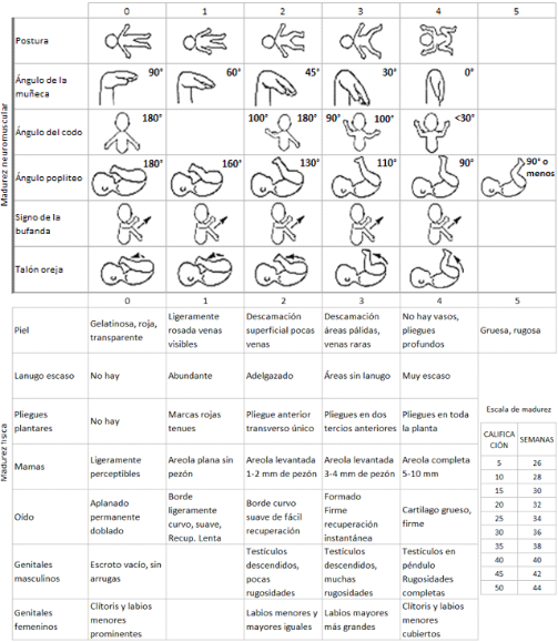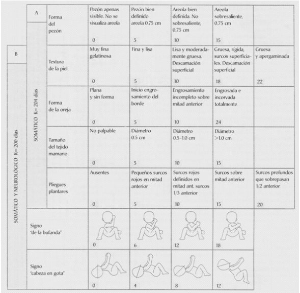 Cinco datos somáticos: 1) Formación del pezón. 2) Textura de la piel. 3) Forma de la oreja. 4) Tamaño del seno (mama) y 5) Surcos plantares; y 2 signos neurológicos: I) signo "de la bufanda" y II) signo "cabeza en gota".