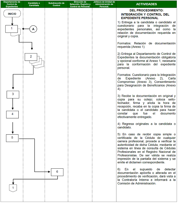 | Departamento de Control de Expedientes | 1) Entrega a la candidata o candidato el cuestionario para la integración de expedientes personales, así como la relación de documentación requerida en original y copia. | Relación de documentación requerida (Anexo 1) |