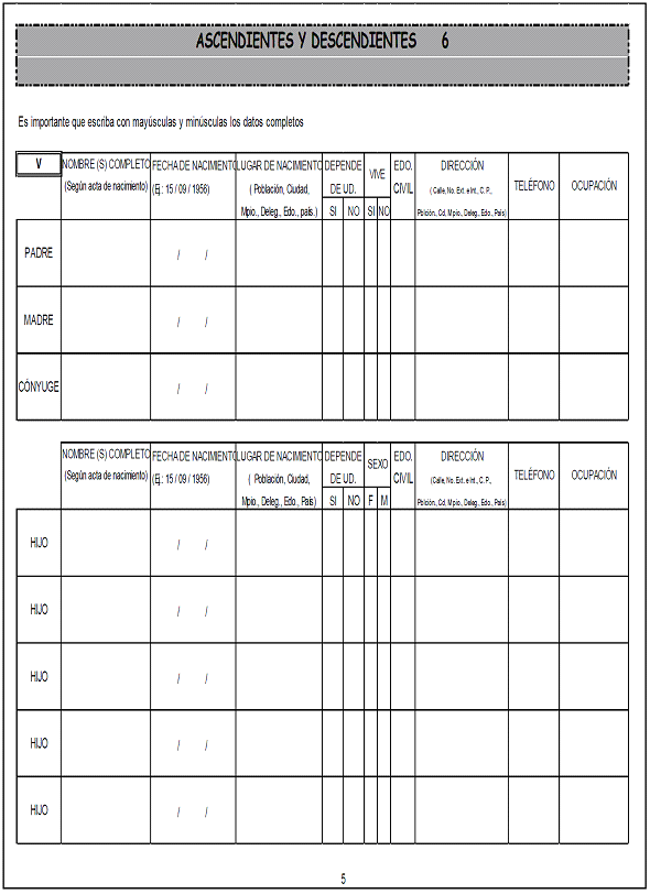 | 6.- | Ascendientes y descendientes: | Anotar el nombre completo de la madre, padre, cónyuge e hijo del aspirante de nuevo ingreso o reingreso; fecha de nacimiento, depende de usted, vive, estado civil. |