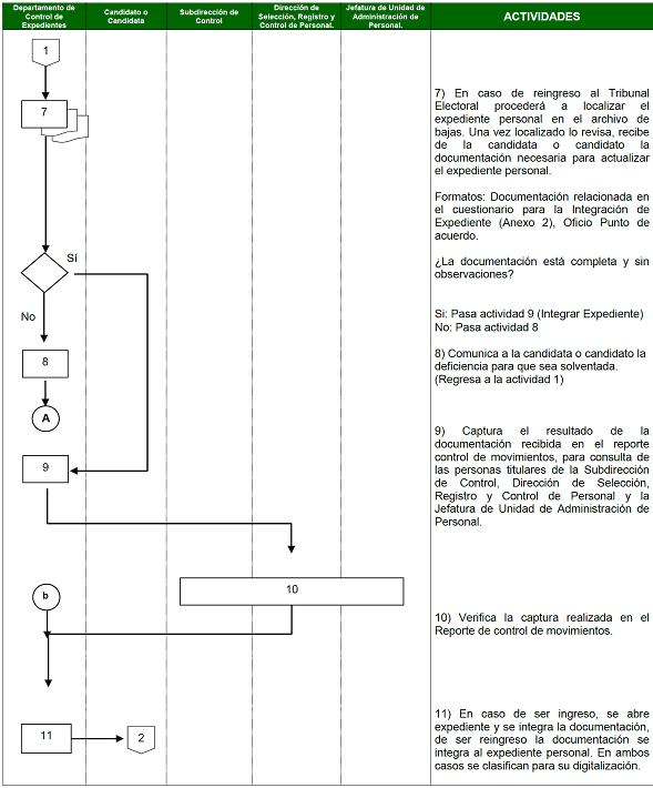 | Departamento de Control de Expedientes | 8) Comunica a la candidata o candidato la deficiencia para que sea solventada. Regresa a la actividad 1 | |