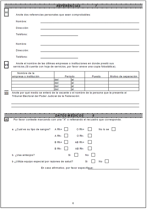 | 7.- | Referencias: | Anotar dos referencias personales comprobables de la servidora o servidor público de nuevo ingreso; nombre completo, dirección y teléfono; las últimas empresas donde prestó sus servicios; período, puesto y motivo de separación; así como el medio por el que se enteró de la vacante o el nombre de la persona que lo presenta al Tribunal Electoral. |