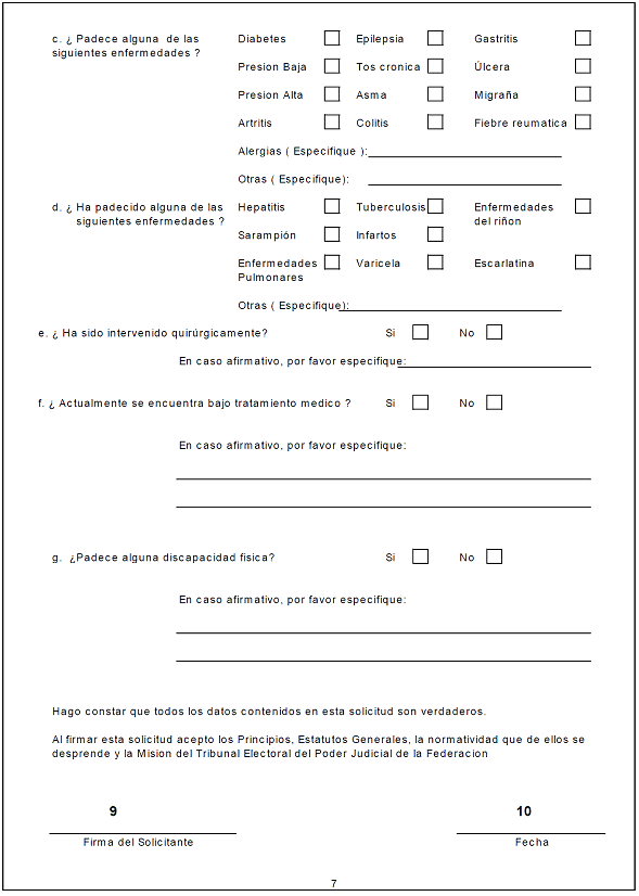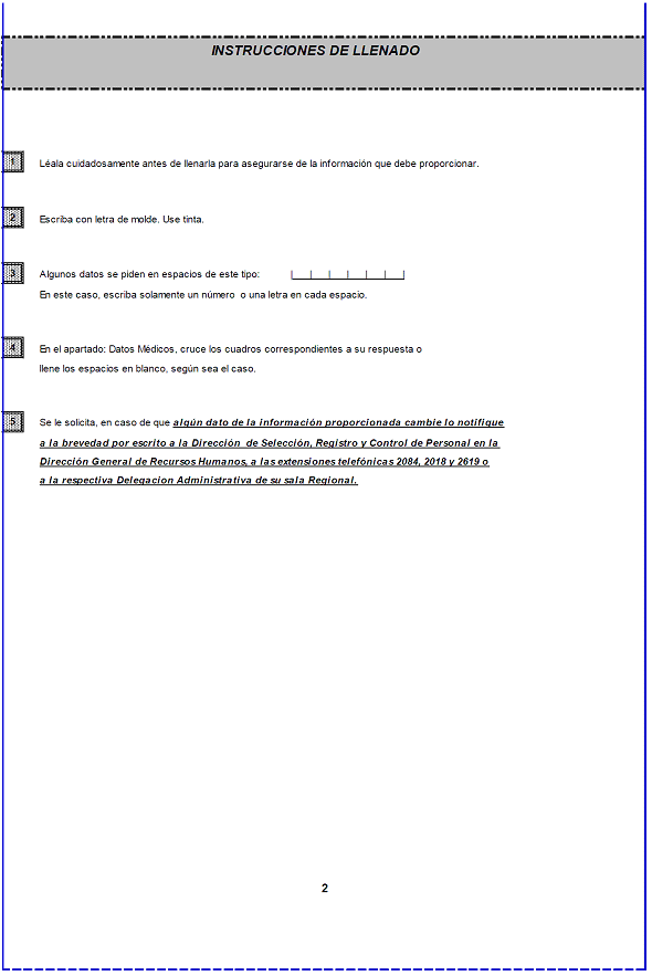 | 8.- | Datos médicos: | Marcar con una "x" la casilla que corresponda. Anotar si la servidora o el servidor público usa o no equipo especial por razones de salud, en caso afirmativo deberá especificar el equipo que utiliza; si ha padecido alguna enfermedad, alergias u otras, especificar; si ha sido intervenido quirúrgicamente, si la respuesta es afirmativa, especificar de qué; si se encuentra o no bajo tratamiento médico, en caso afirmativo deberá indicar el diagnóstico y tratamiento; si padece algún tipo de discapacidad, especificar. |