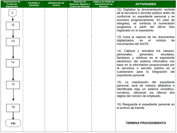 | Departamento de Control de Expedientes | 11) En caso de ser ingreso, se abre expediente y se integra la documentación, de ser reingreso la documentación se integra al expediente personal. En ambos casos se clasifican para su digitalización. 12) Digitaliza la documentación recibida de la servidora o servidor público antes de conformar su expediente personal y se enumera progresivamente. En caso de reingreso, se continúa la numeración progresiva a partir del último folio registrado en el expediente. 13) Inicia la captura de los documentos digitalizados, en el módulo de movimientos del SAITE. 14) Captura y actualiza los campos: personales, generales, escolares, familiares y médicos en el expediente electrónico del sistema informático con base en la información proporcionada por la servidora o servidor público en el cuestionario para la Integración del expediente personal. 15) La clasificación del expediente personal, será de manera alfabética e identificada bajo un sistema cromático-numérico, utilizando los últimos dos dígitos del número de empleado. 16) Resguarda el expediente personal en el archivo de trámite. | Documentación relacionada en el cuestionario para la Integración de Expediente (Anexo 2) SAITE |