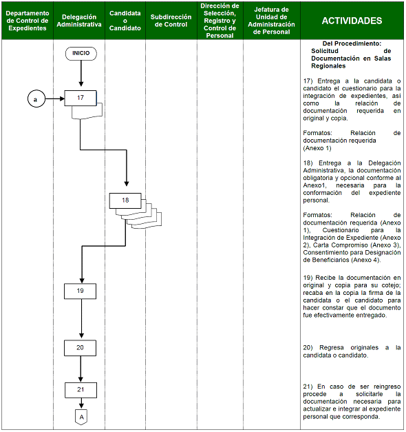 | Delegación Administrativa | 17) Entrega a la candidata o candidato el cuestionario para la integración de expedientes, así como la relación de documentación requerida en original y copia. | Relación de documentación requerida (Anexo 1) |