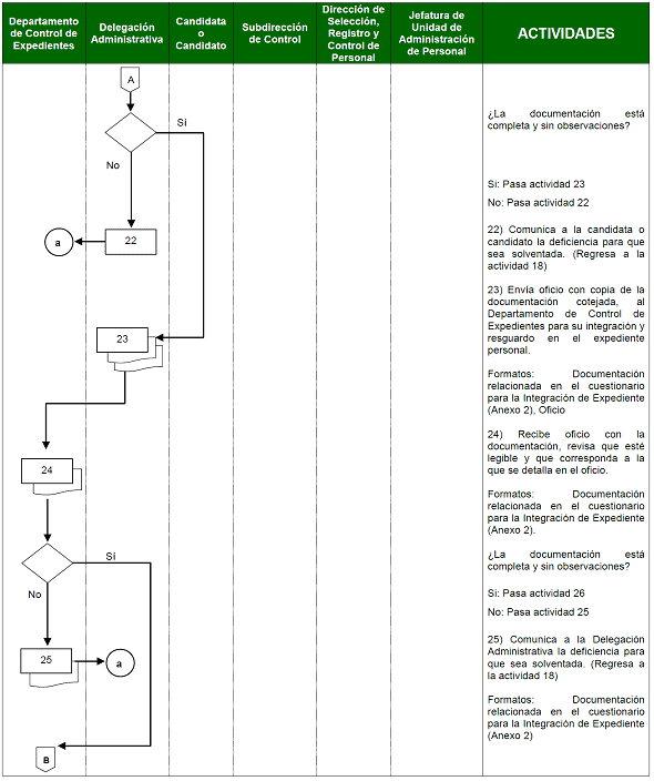 | Delegación Administrativa | 19) Recibe la documentación en original y copia para su cotejo; recaba en la copia la firma de la candidata o el candidato para hacer constar que el documento fue efectivamente entregado. 20) Regresa originales a la candidata o candidato. 21) En caso de ser reingreso procede a solicitarle la documentación necesaria para actualizar e integrar al expediente personal que corresponda. ¿La documentación está completa y sin observaciones? Si: Pasa actividad 23 No: Pasa actividad 22 22) Comunica a la candidata o candidato la deficiencia para que sea solventada. Regresa a la actividad 18 23) Envía oficio con copia de la documentación cotejada, al Departamento de Control de Expedientes para su integración y resguardo en el expediente personal. | Documentación relacionada en el cuestionario para la Integración de Expediente (Anexo 2) Oficio |