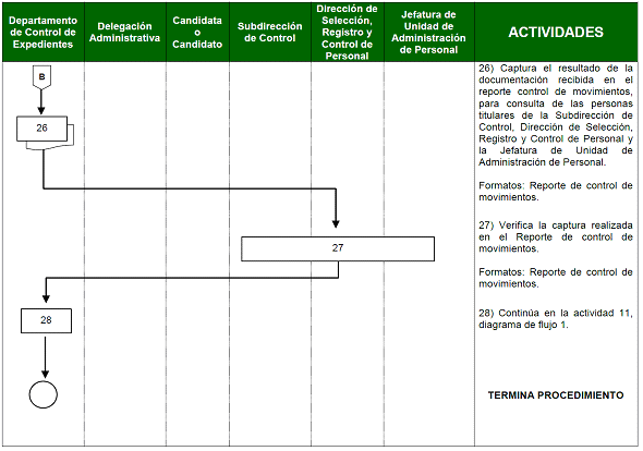 | Departamento de Control de Expedientes | 26) Captura el resultado de la documentación recibida en el reporte control de movimientos, para consulta de las personas titulares de la Subdirección de Control, Dirección de Selección, Registro y Control de Personal y la Jefatura de Unidad de Administración de Personal. | Reporte de control de movimientos |