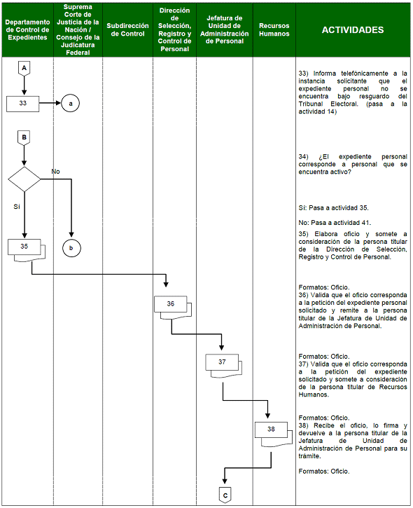 | | ¿El expediente personal corresponde a personal que se encuentra activo? Sí: Pasa a actividad 35 No: Pasa a actividad 41 33) Elabora oficio y somete a consideración de la persona titular de la Dirección de Selección, Registro y Control de Personal. | Oficio |