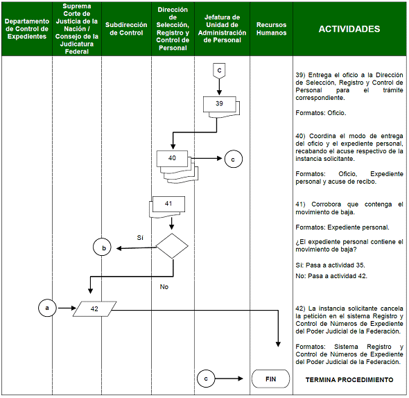 | Dirección de Selección, Registro y Control de Personal | 39) Corrobora que contenga el movimiento de baja. ¿El expediente personal contiene el movimiento de baja? Sí: Pasa a actividad 35 No: Pasa a actividad 42 | Expediente personal |