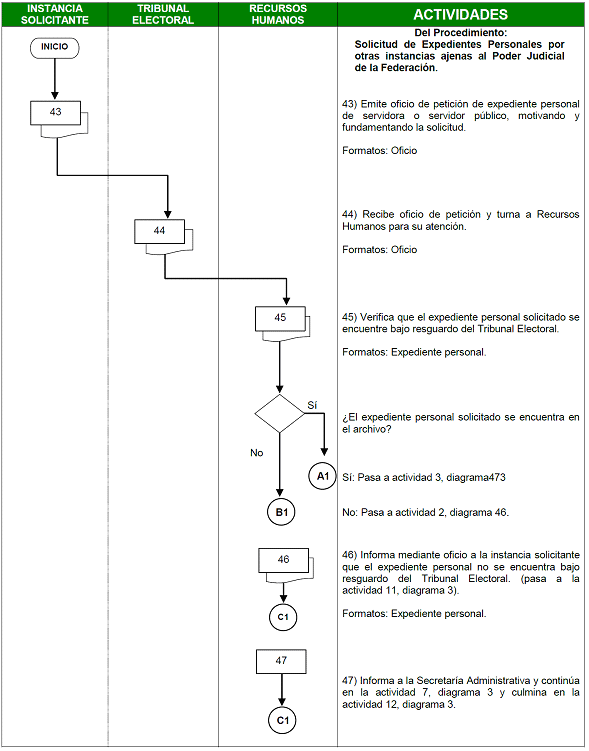 | Recursos Humanos | 43) Verifica que el expediente personal solicitado se encuentre bajo resguardo del Tribunal Electoral. ¿El expediente personal solicitado se encuentra en el archivo? Sí: Pasa a actividad 47 No: Pasa a actividad 46 | Expediente personal |
