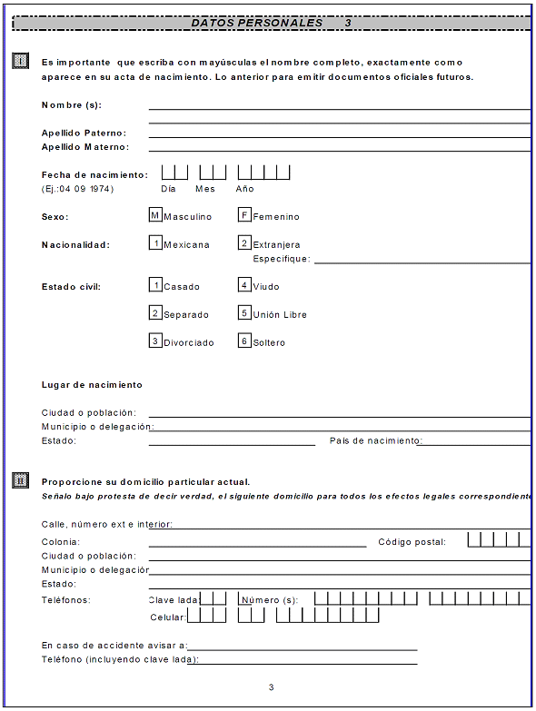 | 3.- | Datos personales: | Anotar el nombre de la servidora o servidor público de nuevo ingreso exactamente como aparece en el acta de nacimiento; el lugar de nacimiento y proporcionar el domicilio particular. Marcar con una "x" la casilla que corresponda. |