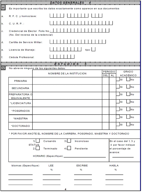 | 5.- | Estudios: | Anotar el nivel escolar que tiene la servidora o servidor público de nuevo ingreso o reingreso; nombre de la institución, dirección, periodo y grado académico. Marcar con una "x" la casilla que corresponda, el grado de avance y horario especificado. Anotar el idioma(s) y porcentaje de manejo en la lectura, escritura y habla. |