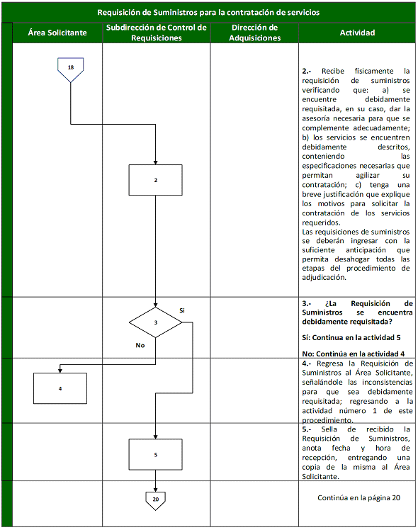 | Subdirección de Control de Requisiciones | 2.- Recibe físicamente la requisición de suministros verificando que: a) se encuentre debidamente requisitada, en su caso, dar la asesoría necesaria para que se complemente adecuadamente; b) los servicios se encuentren debidamente descritos, conteniendo las especificaciones necesarias que permitan agilizar su contratación; c) tenga una breve justificación que explique los motivos para solicitar la contratación de los servicios requeridos. Las requisiciones de suministros se deberán ingresar con la suficiente anticipación que permita desahogar todas las etapas del procedimiento de adjudicación. | Requisición de Suministros |
