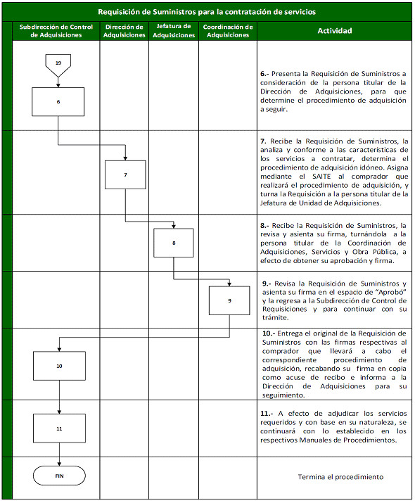 | Dirección de Adquisiciones | 7. Recibe la Requisición de Suministros la analiza y conforme a las características de los servicios a contratar, determina el procedimiento de adquisición idóneo. Asigna mediante el SAITE al comprador que realizará el procedimiento de adquisición, turnando la Requisición a la persona titular de la Unidad de Adquisiciones. | Requisición de Suministros |