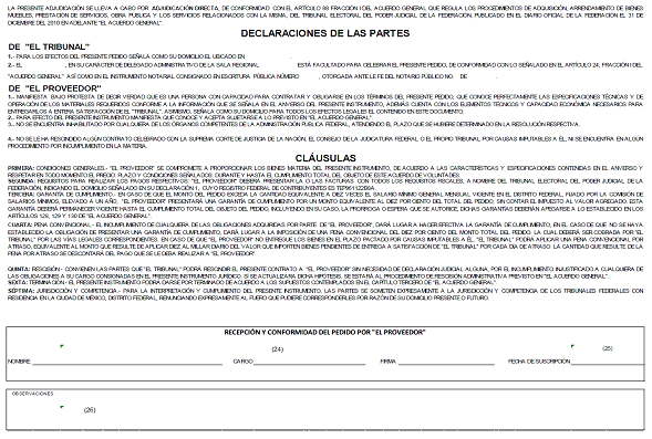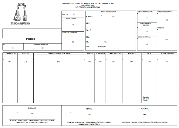 | 14 15 16 17 18 19 20 21 22 23 24 25 26 | Descripción de los bienes Unidad Cantidad Costo unitario Subtotal IVA Total partida Elaboró Revisó Autorizó Proveedor Fecha Observaciones | Anotar en forma clara, precisa y completa las características y especificaciones de cada uno de los bienes requeridos. Anotar el tipo de medición que corresponda según el bien solicitado y de conformidad con el catálogo de unidad (pza., litro, galón, kilo, lata, paquete, etc.) Anotar el número de bienes solicitados por partida, según la requisición de suministros. Anotar el costo unitario de los bienes solicitados. Anotar la cantidad que resulte de multiplicar la cantidad de bienes por el costo unitario de los mismos. Anotar el importe que resulte de calcular por cada subtotal el IVA correspondiente. Anotar el importe que resulte de sumar el subtotal más el IVA de cada partida. Anotar el nombre completo y firma autógrafa de la persona titular de la Subdirección de Recursos Materiales y Servicios Generales. Anotar el nombre completo y firma autógrafa de la persona titular de la Subdirección de Recursos Humanos y Financieros. Anotar el nombre completo y firma autógrafa de la persona titular de la Delegación Administrativa. Anotar el nombre completo, el cargo que ostenta y estampar la firma autógrafa de la persona autorizada como representante legal o apoderado de la empresa que suministra los bienes o servicios. Anotar la fecha en que se firma el pedido. Anotar aquellas observaciones o comentarios que se requiera resaltar en el pedido. |