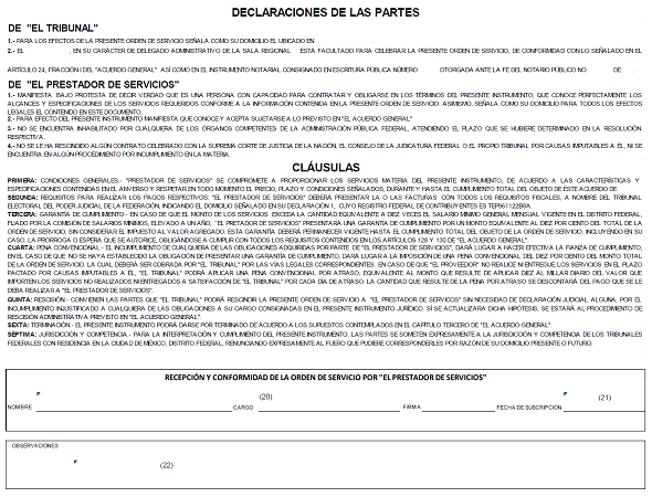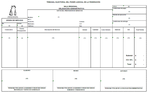 | 1 2 3 4 5 6 7 8 9 10 11 12 13 14 | No. Fecha Datos del prestador de servicios Hoja. de. Condiciones de pago Periodo de ejecución Condiciones de entrega Consecutivo Partida presupuestal Descripción del servicio Unidad de medida Cantidad Costo unitario Subtotal | Anotar el número consecutivo de la orden de servicio asignado por la Subdirección de Recursos Materiales y Servicios Generales. Anotar la fecha de elaboración de la orden de servicio. Anotar el nombre o razón social, RFC, calle, colonia, código postal, teléfono, país y delegación del prestador de servicios elegido. Anotar el número de hoja que corresponda del número total de hojas que constituyan la orden de servicio. Anotar los días pactados para efectuar el pago, especificando si se trata de días hábiles o naturales. Anotar el tiempo que se necesita para llevar a cabo el servicio. Se deberá especificar si se trata de días hábiles o naturales. Anotar las condiciones acordadas para la entrega de los bienes, especificando si serán totales, parciales, etc. Anotar el número consecutivo de la partida que se trate. Anotar la clave presupuestal de la partida que se trate. Anotar en forma clara, precisa y completa las características y especificaciones de cada uno de los bienes o servicios requeridos. Anotar el tipo de medición que corresponda según el bien o servicio solicitado y de conformidad con el catálogo de unidad (pza., litro, galón, kilo, lata, paquete) Anotar el número de bienes o servicios solicitados por partida, según la requisición de suministros. Anotar el precio unitario cotizado por el prestador de servicios. Anotar la cantidad que resulte de multiplicar la cantidad solicitada por el costo unitario cotizado. |