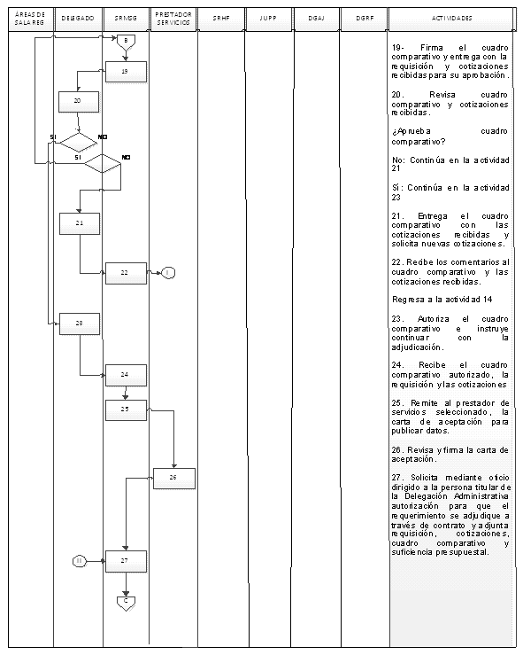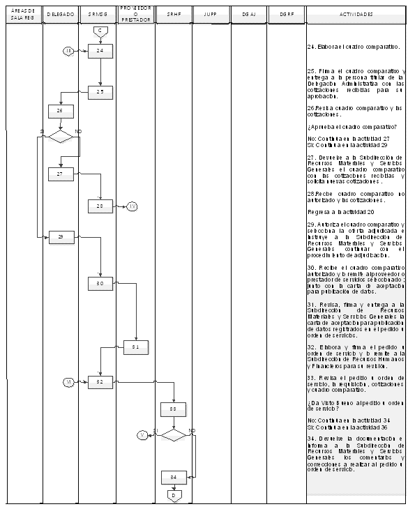 | Persona titular de la Subdirección de Recursos Materiales y Servicios Generales | 28. Recibe cuadro comparativo no autorizado y las cotizaciones. Regresa a la actividad 20. | Cuadro comparativo (anexo II) |