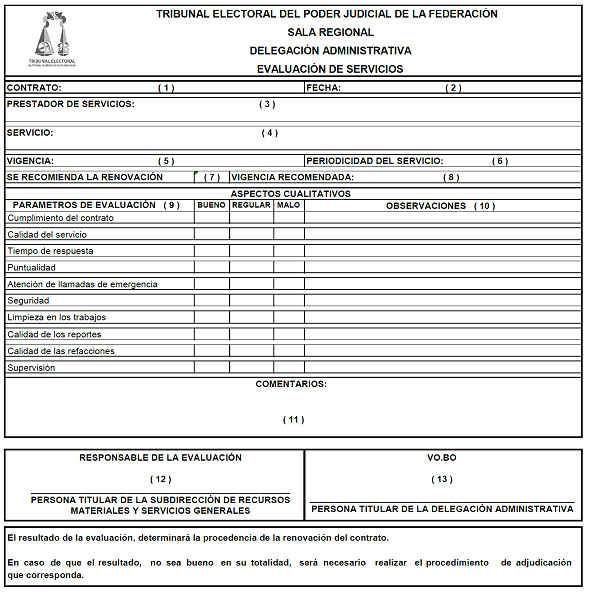 | 1 2 3 4 5 6 7 8 9 10 11 12 13 | Contrato Fecha Prestador de servicios Servicio Vigencia Periodicidad del servicio Se recomienda la renovación Vigencia recomendada Parámetros de Evaluación Observaciones Comentarios Responsable de la evaluación Vo. Bo. | Anotar el número de contrato. Anotar la fecha de elaboración de la evaluación del servicio. Anotar el nombre o razón social completa de la empresa o del prestador de servicios que proporcionó el servicio durante el ejercicio. Anotar el nombre del servicio al que hace referencia el contrato en cuestión. Anotar el día, mes y año pactado para el inicio del servicio, así como el día, mes y año de término. Anotar el período de tiempo establecido para proporcionar el servicio (diario, cada tres días, semanal, quincenal, mensual, bimestral, trimestral, semestral o anual). Anotar en el recuadro "SÍ" o "NO" con base en el histórico de las evaluaciones realizadas. Anotar el día, mes y año de inicio y término en que se considera necesario contar con el servicio. Marcar con una "X" cada uno de los parámetros a evaluar, calificando el servicio como "Bueno", "Regular" o "Malo". Anotar en forma clara, precisa y completa todos aquellos elementos que justifiquen el valor de la calificación dado a cada parámetro evaluado. Anotar en forma clara, precisa y completa todos aquellos elementos que se requieran para resaltar y justificar la evaluación realizada. Anotar el nombre completo y firma autógrafa de la persona titular de la Subdirección de Recursos Materiales y Servicios Generales. Anotar el nombre completo y firma autógrafa del persona titular de la Delegación Administrativa. |
