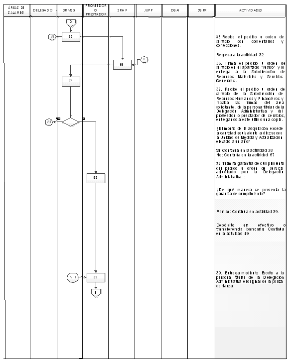 | Persona titular de la Subdirección de Recursos Materiales y Servicios Generales | 35. Recibe el pedido u orden de servicio con comentarios y correcciones. Regresa a la actividad 32. | Pedido (anexo III) Orden de servicio (anexo IV) |
