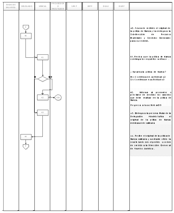 | Persona titular de la Subdirección de Recursos Materiales y Servicios Generales | 41. Revisa que la póliza de fianza contenga los requisitos mínimos. ¿Aprueba la póliza de fianza? No. Continúa en la actividad 42. Sí. Continúa en la actividad 43. 42. Informa al proveedor o prestador de servicios los cambios que debe realizar en la póliza de fianza. Regresa a la actividad 39 43. Entrega a la persona titular de la Delegación Administrativa el original de la póliza de fianza debidamente validada. | Póliza de Fianza Revisada Póliza de Fianza revisada Póliza de Fianza validada |
