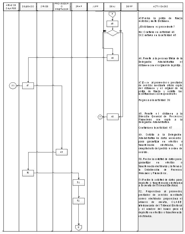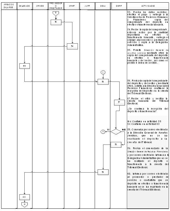 | Persona titular de la Subdirección de Recursos Humanos y Financieros | 51. Recibe la solicitud de datos para depósito o transferencia electrónica a la cuenta del Tribunal Electoral. 52. Proporciona al proveedor o prestador de servicios mediante correo electrónico el número de cuenta, CLABE interbancaria del Tribunal Electoral y el nombre del banco para el depósito en efectivo o transferencia electrónica. | Recepción de solicitud Correo electrónico |