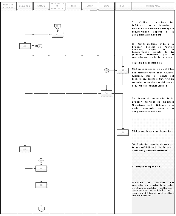 | Persona titular de la Dirección General de Asuntos Jurídicos | 69. Revisa copia del comprobante del depósito y del recibo y mediante oficio, solicita a la Dirección General de Recursos Financieros confirmar la recepción del depósito en la cuenta del Tribunal Electoral. | Oficio |