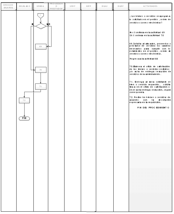 | Persona titular de la Subdirección de Recursos Materiales y Servicios Generales | 69. Solícita al almacén, proveedor o prestador de servicios los cambios necesarios para cumplir con lo establecido en el pedido, orden de servicio o correo electrónico. Regresa a la actividad 68. 70. Elabora el oficio de satisfacción de los bienes o servicios y/o acta de entrega recepción de servicios de mantenimiento. 71. Entrega al área solicitante el bien o servicio requerido, solicita firma en el oficio de satisfacción o en el acta entrega recepción, según corresponda. | Oficio o correo electrónico Oficio y/o acta de entrega recepción de servicios de mantenimiento (anexo VIII). Oficio de satisfacción y/o acta de entrega recepción de servicios de mantenimiento (anexo VIII). |