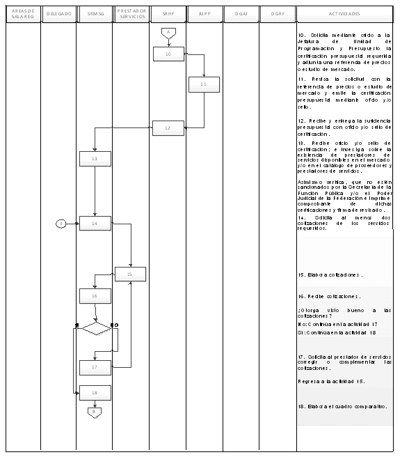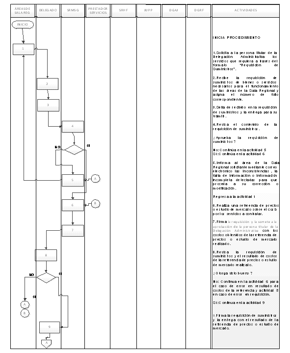 | Persona titular de la Subdirección de Recursos Materiales y Servicios Generales | 4. Revisa el contenido de la requisición de suministros. ¿Aprueba la requisición de suministros? No. Continúa en la actividad 5. Sí. Continúa en la actividad 6. 5. Informa al área de la Sala Regional solicitante mediante correo electrónico las inconsistencias, la falta de información o información incompleta detectadas para que proceda a su corrección o modificación. Regresa a la actividad 1 6. Realiza una referencia de precios o estudio de mercado sobre el costo por los servicios a contratar. 7. Firma la requisición y la somete a la aprobación de la persona titular de la Delegación Administrativa con los costos obtenidos de la referencia de precios o estudio de mercado realizado. | Requisición de suministros (anexo I) Correo Electrónico Referencia de precios o estudio de mercado |