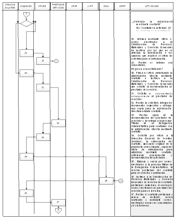 | Persona titular de la Delegación Administrativa | ¿Autoriza la adjudicación mediante contrato? No. Continúa en la actividad 28. Sí. Continúa en la actividad 30. 28. Informa mediante oficio o correo electrónico a la Subdirección de Recursos Materiales y Servicios Generales los motivos por los que no se autoriza la adjudicación o los cambios que requiere el oficio de solicitud para su autorización. | Oficio o correo electrónico |