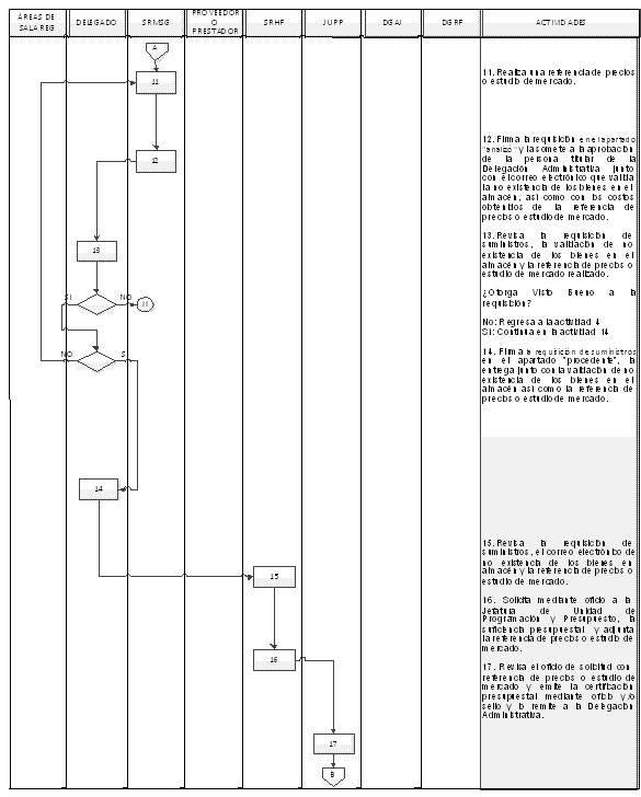 | Persona titular de la Delegación Administrativa | 13. Revisa la requisición de suministros, la validación de no existencia de los bienes en el almacén y la referencia de precios o estudio de mercado. ¿Otorga visto bueno a la requisición? No. Regresa a la actividad 4. Sí. Continúa en la actividad 14. 14. Firma la requisición de suministros en el apartado "procedente", la entrega a la Subdirección de Recursos Humanos y Financieros junto con la validación de no existencia de los bienes en el almacén, así como con la referencia de precios o estudio de mercado. | Requisición de suministros (anexo I) |