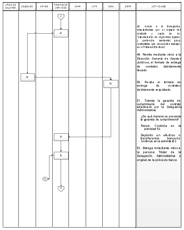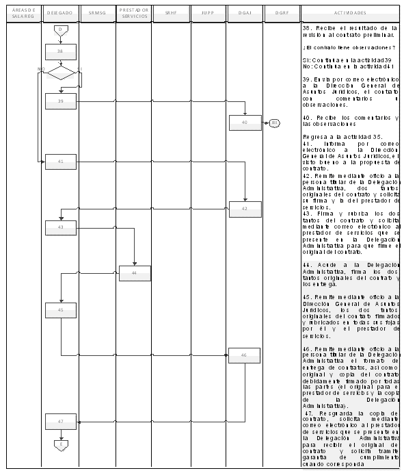 | Persona titular de la Dirección General de Asuntos Jurídicos | 46. Remite mediante oficio a la persona titular de la Delegación Administrativa el formato de entrega de contratos, así como original y copia del contrato debidamente firmado por todas las partes (el original para el prestador de servicios y la copia para la Delegación Administrativa) | Oficio Contrato |